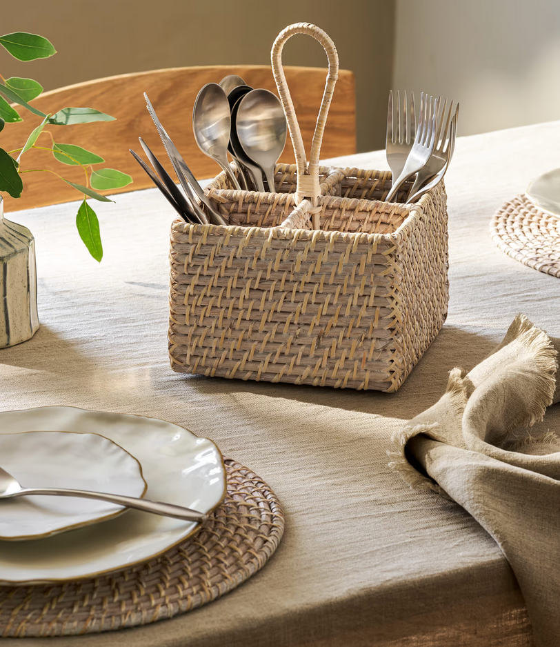 Make setting the table simple and stylish with the Foye Rattan Cutlery Caddy. Perfect for family meals, alfresco dining, or dinner parties, this handwoven caddy keeps knives, forks, and spoons neatly organised and easy to carry.