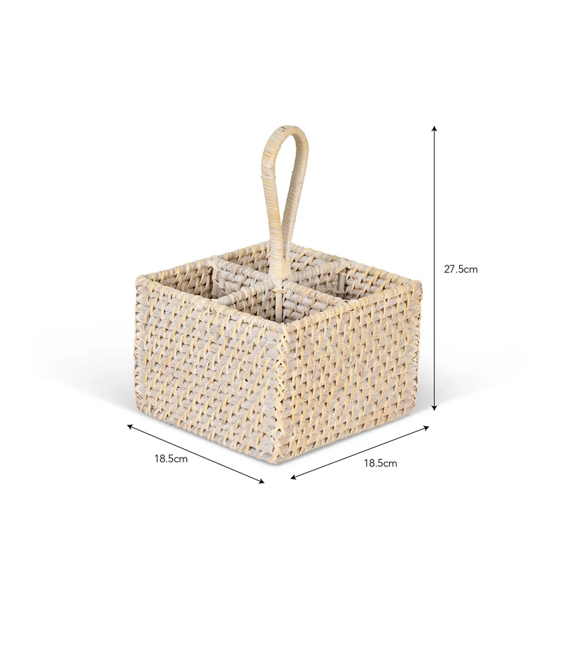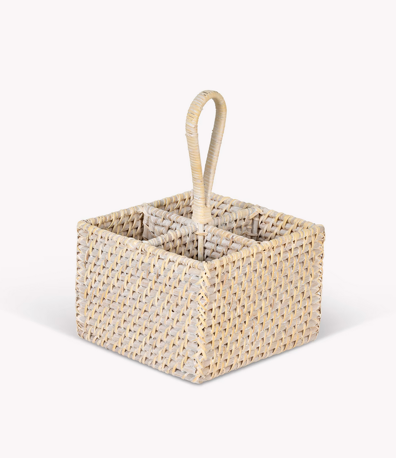 Crafted in Vietnam from natural rattan and finished with a soft whitewash, it complements any colour scheme and brings a rustic touch to your table setting. Designed with four compartments and a sturdy loop handle, it’s as practical as it is decorative.