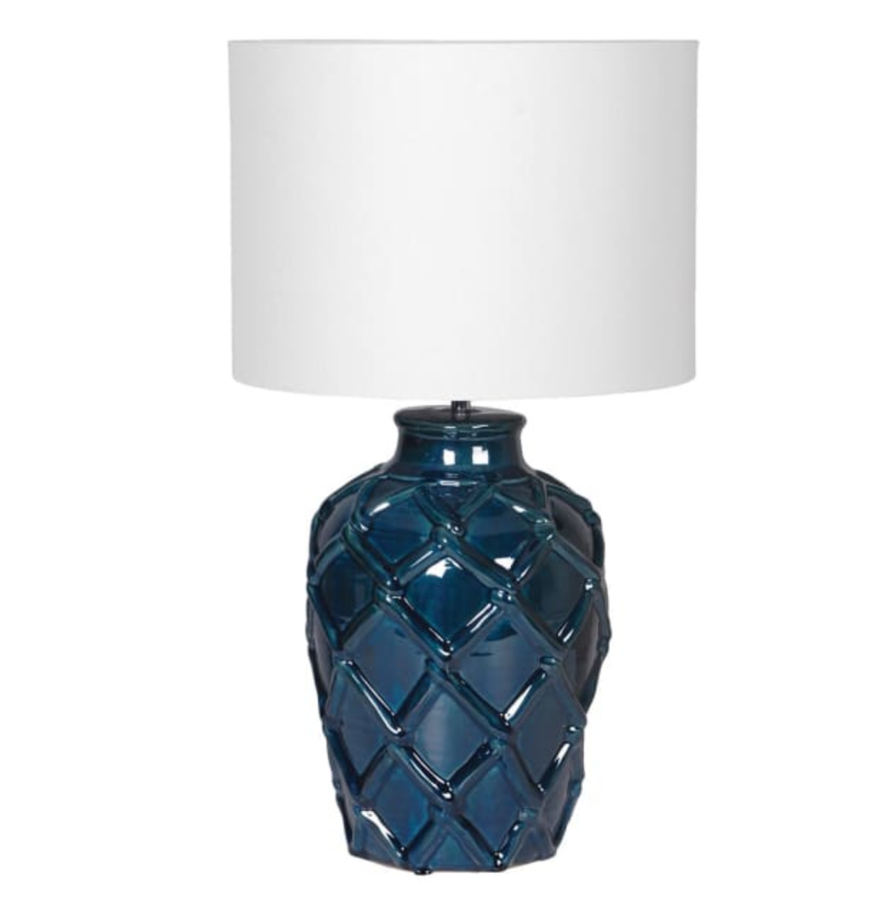 The Eden Deep Blue Ceramic Table Lamp brings depth, warmth, and contemporary elegance to your space. Crafted from high-quality ceramic, the base features a distinctive rope-inspired texture and a rich blue glaze that catches the light beautifully.