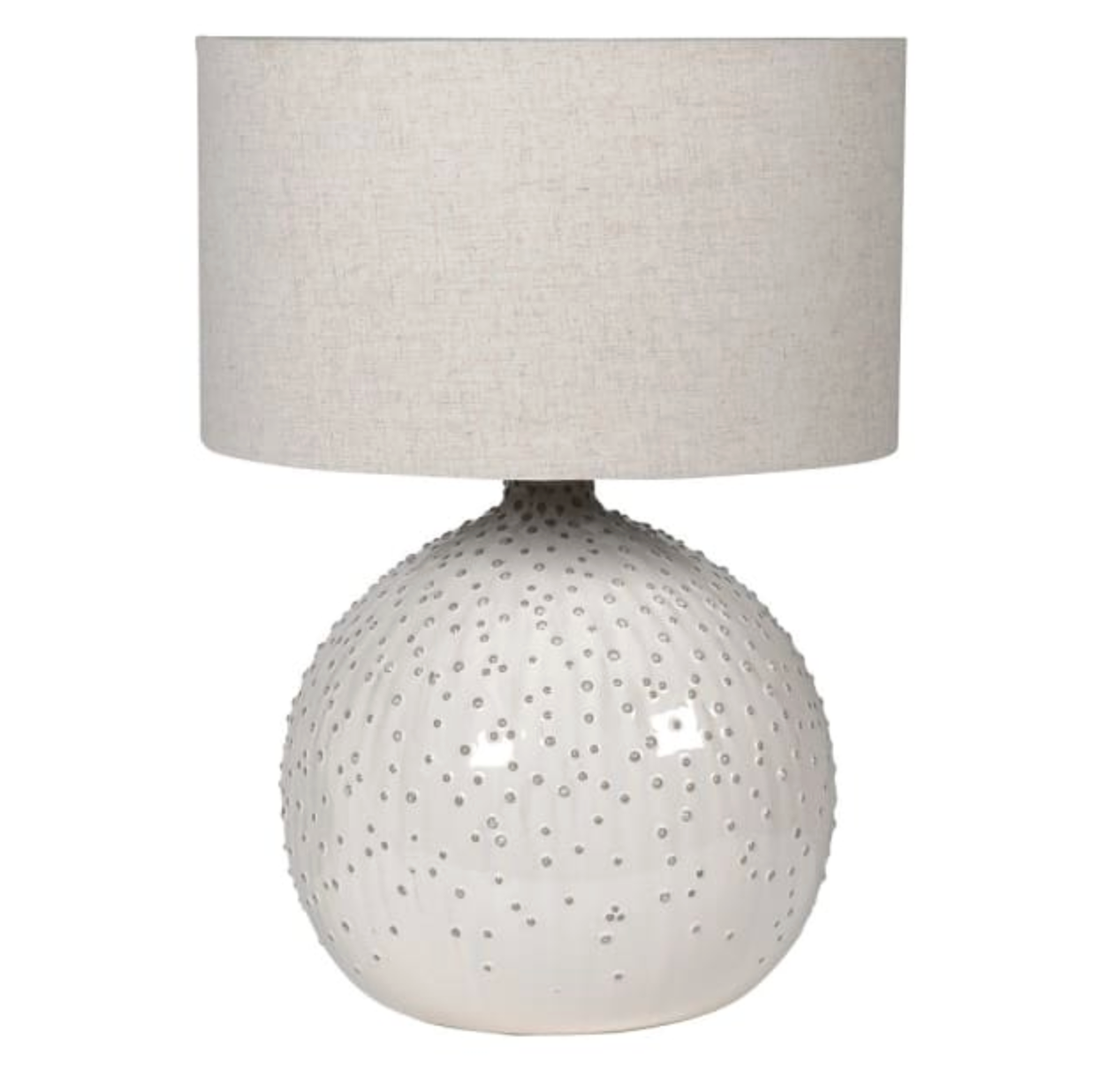 Elegant yet playful, the Isla White Ceramic Table Lamp brings a touch of texture and brightness to your home. The rounded ceramic base features a raised dotted pattern that adds subtle dimension and visual interest, finished in a glossy white glaze for a clean, contemporary look.