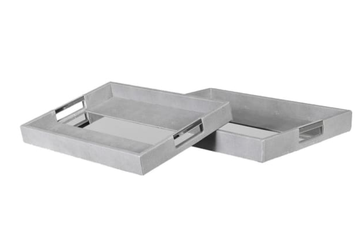 Set of 2 Grey Faux Shagreen Trays with Silver Trim – Elegant Decorative Serving Trays